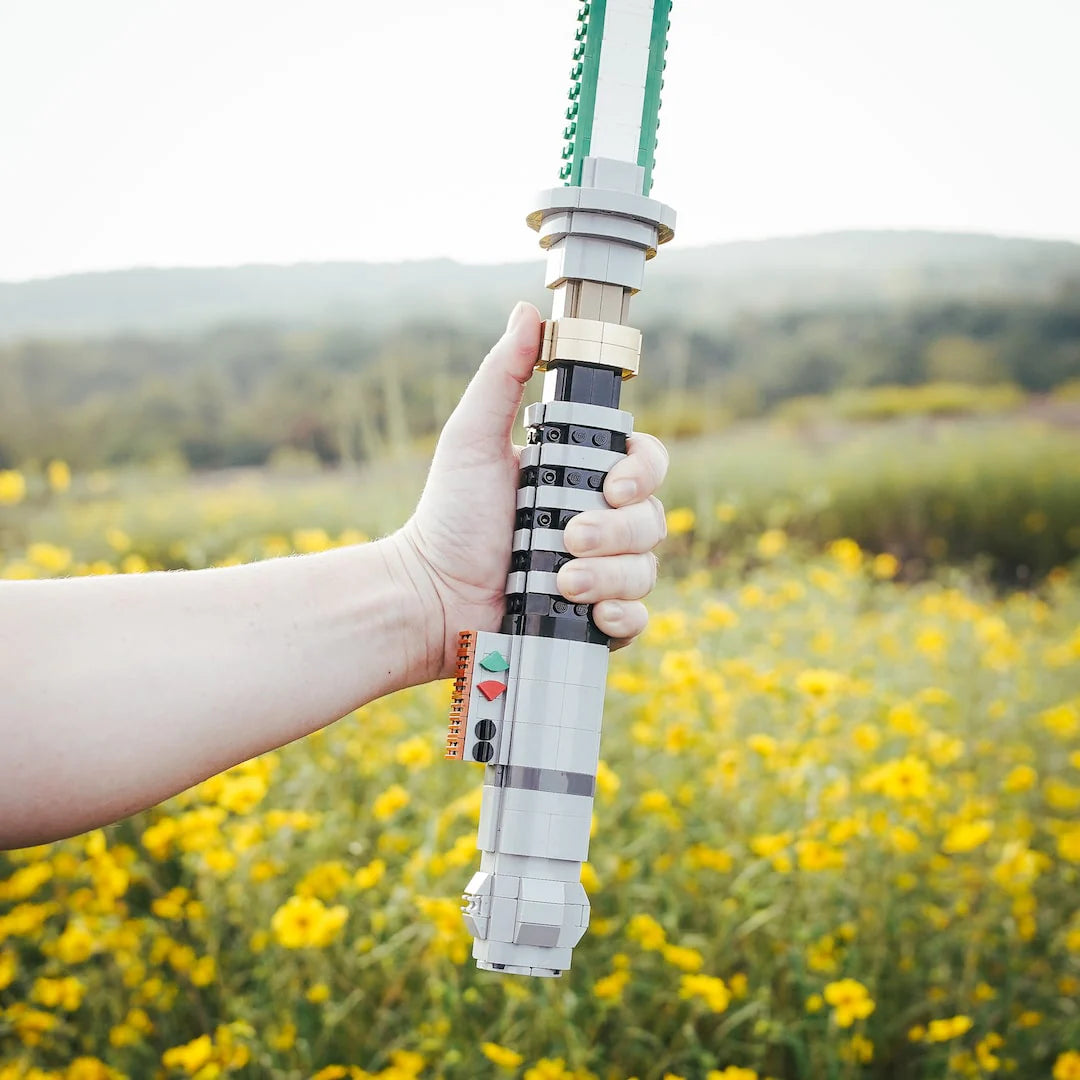 This saber replica is built with nearly 700 LEGO® bricks, designed with playability in mind. You can swing it, and even clash with other sabers, if you're careful. The blade is constructed using creative building techniques to capture the bright glow and give it the strength a wieldable blade should have.